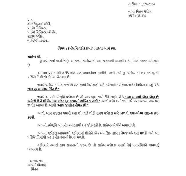 વડોદરાના જાગૃત ના નાગરિક ચિંતને વડોદરા વાસીઓની ચિંતા કરતા પ્રધાનમંત્રી નરેન્દ્ર મોદીને વડોદરામાં આવવા વિનંતી કરતો પત્ર લખ્યો છે. ચિંતન પરીખે પત્રમાં જણાવ્યું છે કે કર્મભૂમિ વડોદરામાં પધારવા આમંત્રણ