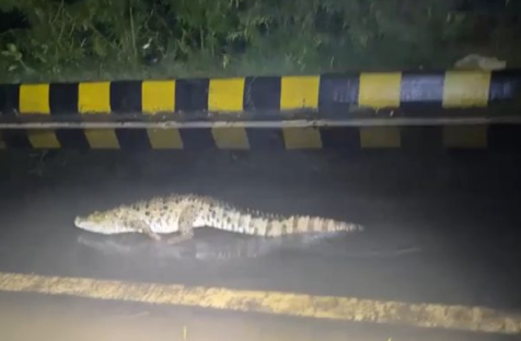 વડોદરાના વાઘોડિયા તાલુકાના વ્યારા ગામ નજીક રાત્રીના સમયે એક મહાકાય મગર લટાર પર નીકળ્યો