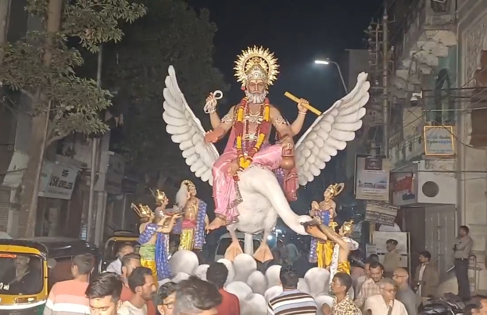 શહેરના વાડી-ભાટવાડાથી વિશ્વકર્મા ભગવાનની – પ્રતિમાની વિસર્જન યાત્રામાં હજારો ભક્તો ડી.જે અને નાસિક – ઢોલના તાલે ભક્તિના રંગે રંગાયા હતા. ખરાદી સમાજના – અગ્રણીઓએ આરતી ઊતારી ધન્યતા અનુભવી હતી. – ફટાકડાના ધૂમધડાકા અને આકાશી આતશબાજીએ વાતાવરણ = મેઘધનુષી બનાવ્યું હતું. ભક્તોએ વિશ્વકર્મા ભગવાનની – પ્રતિમા પર પવિત્ર નદીના જળનો છંટકાવ કરી પ્રતિકાત્મક વિસર્જન કર્યું હતું.