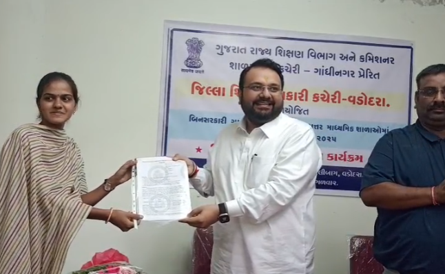 વડોદરા શહેર અને જિલ્લામાં ફરજ બજાવતા 123 શિક્ષકોને આજે વડોદરા જિલ્લા શિક્ષણ કચેરી ખાતે એનાયત પત્ર વિતરણ કરવામાં આવ્યા હતા. જેમાં અર્બન અને રૂરલ માં ફરજ બજાવશે સાથે ગ્રાન્ટેડ અને અન ગ્રાન્ટેડ શાળામાં ફરજ બજાવશે. હવે મધ્યમ વર્ગ ના બાળકોને આ શિક્ષકો ઉચ્ચ શિક્ષણ આપે બાળકોનું ભવિષ્ય ઉજવળ બનાવશે પ્રધાનમંત્રી નરેન્દ્ર મોદી વિકસિત ભારત તરફ આગળ વધી રહ્યા છે ત્યારે આ શિક્ષકોને એના જ પત્ર વિતરણ કરી ખૂબ જ બાળકોનું ભવિષ્ય ઉજવળ બનાવશે. ત્યારે આજે વડોદરા શહેર જિલ્લા શિક્ષણ કચેરી ખાતે 123 શિક્ષકોને એનાયત પત્ર આપી શુભેચ્છા આપવામાં આવી હતી વધુમાં વડોદરામાં સાંસદ હેમાંગ જોશી એ જણાવ્યું કે