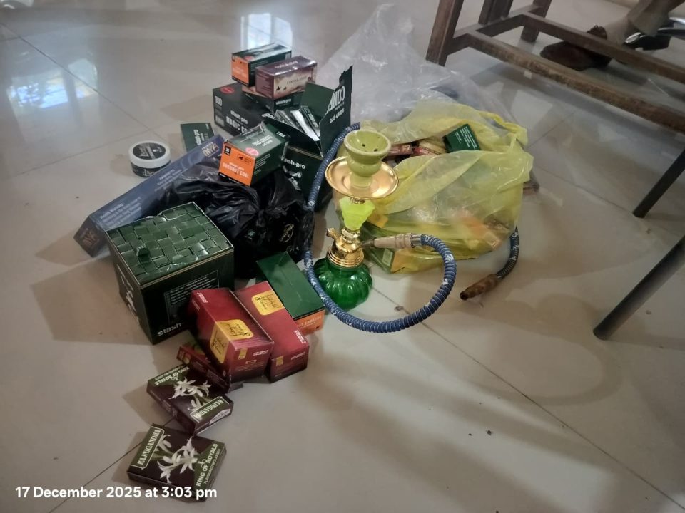 આ કાર્યવાહી દરમિયાન સરકાર દ્વારા પ્રતિબંધિત ઇ-સિગારેટ પણ જપ્ત કરવામાં આવી છે. જપ્ત કરાયેલા મુદ્દામાલમાં પ્રતિબંધિત ગોગો પેપર, સ્મોકિંગ કોન, હુક્કા સામગ્રી, કોલસા અને ઇલેક્ટ્રોનિક સિગારેટનો સમાવેશ થાય છે.