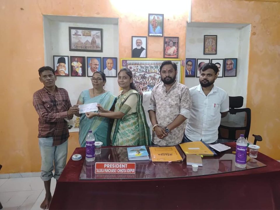 છોટાઉદેપુર તાલુકા પંચાયત વતી છોટાઉદેપુર તાલુકામાં આવતા તેજગઢ, રંગપુર,લુની, નાલેજ સહિતના ગામોના લાભાર્થીઓને ભારે વરસાદના કારણે મકાન ધરાશાયી થયું હોય તેવા લાભાર્થીઓને છોટાઉદેપુર તાલુકા પંચાયત પ્રમુખ કલ્પનાબેન રાઠવાના હસ્તે ચેક વિતરણ કરવામાં આવ્યા હતા. આ ચેક વિતરણ પ્રસંગે તાલુકા પંચાયતના પ્રમુખની સાથે તાલુકા પંચાયતના ઉપપ્રમુખ જયદીપભાઇ રાઠવા, જિલ્લા ભાજપના યુવા નેતા સંગ્રામસિંહ રાઠવા, જિલ્લા પંચાયતના સદસ્ય રાજદીપભાઈ રાઠવા સહિત આગેવાનો ઉપસ્થિત રહ્યા હતા. અને 10 જેટલા લાભાર્થીઓને ચેક વિતરણ કરાયા હતા.