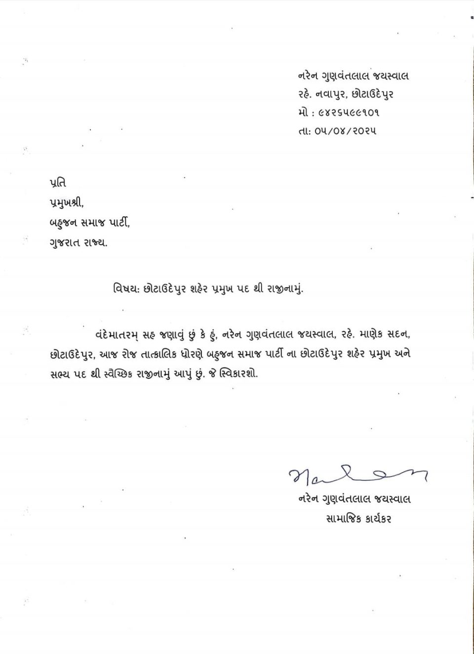 છેલ્લા 15 વર્ષથી નરેનભાઈ જયસ્વાલ છોટાઉદેપુર શહેર બહુજન સમાજ પાર્ટીના હતા પ્રમુખ,