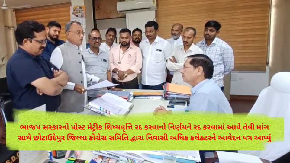 છોટાઉદેપુર જિલ્લા કોંગ્રેસ સમિતિ દ્વારા ગુજરાત વિધાનસભાના પૂર્વ વિરોધ પક્ષના નેતા સુખરામભાઇ રાઠવાની આગેવાનીમાં મોટી સંખ્યામાં જિલ્લા કોંગ્રેસના આગેવાનો તાલુકા કોંગ્રેસના પ્રમુખો અને મોટી સંખ્યામાં કાર્યકર્તાઓ દ્વારા છોટાઉદેપુર જિલ્લા સેવા સદન ખાતે નિવાસી અધિક કલેક્ટરને આવેદનપત્ર આપ્યું હતું. જિલ્લા કોંગ્રેસ દ્વારા આપવામાં આવેલા આવેદનપત્રમાં જણાવ્યું હતું. કે આદિવાસી સમાજના બાળકો મેટ્રિક પછી વધારેમાં વધારે સારા કોર્સમાં અભ્યાસ કરી શકે તે માટે જ્યારે કેન્દ્રમાં કોંગ્રેસની સરકાર હતી ત્યારે ૧ જુલાઈ, ૨૦૧૦થી પોસ્ટ મેટ્રિક શિષ્યવૃત્તિની યોજના બનાવવામાં આવી હતી. અને આ યોજના મુજબ કેન્દ્ર સરકાર ૭૫% અને ૨૫% રાજ્ય સરકારે ભોગવવાના અને યોજનામાંથી આદિવાસી સમાજના એટલે કે અનુસૂચિત જનજાતિ(ST)ના વિદ્યાર્થીઓ માટે મેટ્રિક પછી અભ્યાસમાં શિષ્યવૃત્તિની યોજના જાહેર કરવામાં આવી હતી. આ યોજનાની એક મોટી બાબત એ હતી કે મેનેજમેન્ટ કોટામાં પણ આદિવાસી સમાજનો બાળક પ્રવેશ મેળવે તો તે શિષ્યવૃત્તિને હકદાર બને. આ યોજનાના કારણે ગુજરાત અને દેશના લાખો બાળકોને મેટ્રિક પછીના અભ્યાસમાં ખૂબ મોટી સહાય શિષ્યવૃત્તિ દ્વારા પ્રાપ્ત થઈ રહી હતી. ભારતીય જનતા પાર્ટીની કેન્દ્રમાં અને ગુજરાતમાં રહેલી સરકારે આદિવાસી સમાજના બાળકોને મળતી આ શિષ્યવૃત્તિને બંધ કરીને આદિવાસી બાળકોને ખૂબ મોટો અન્યાય કરેલો છે. ગુજરાત સરકારે તાજેતરમાં એક પરિપત્ર બહાર પાડીને હવે પછી કોઈપણ આદિવાસી બાળક (અનુસૂચિત જનજાતિનો વિદ્યાર્થી) મેટ્રિક પછી મેનેજમેન્ટ કોટામાં ઉપર પ્રવેશ મેળવે તો તેને શિષ્યવૃત્તિ નહીં આપવાનો નિર્ણય કર્યો છે. જેને લઈને જિલ્લા કોંગ્રેસ દ્વારા નિવાસી અધિક કલેકટરને આવેદન પત્ર આપી પત્ર રદ કરવાની માંગ કરી હતી.