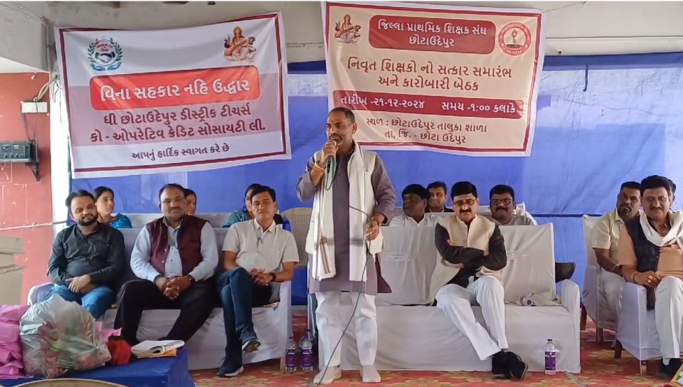 છોટાઉદેપુર જિલ્લા પ્રાથમિક શિક્ષક સંઘ દ્વારા છોટાઉદેપુર જિલ્લાના નિવૃત શિક્ષકોનો દ્વિતીય સન્માન સમારોહ કાર્યક્રમનું આયોજન કરવામાં આવ્યું હતું. છોટાઉદેપુર નગરમાં આવેલ તાલુકા શાળા નંબર એક ખાતે આ કાર્યક્રમ યોજાયો હતો. કાર્યક્રમમાં છોટાઉદેપુર લોકસભાના સાંસદ જશુભાઈ રાઠવા અને ધારાસભ્ય રાજેન્દ્રસિંહ રાઠવા મુખ્ય મહેમાન તરીકે ઉપસ્થિત રહ્યા હતા. જેમાં નિવૃત શિક્ષકોનું સન્માન કરવામાં આવ્યું હતું. કાર્યક્રમમાં સાંસદ અને ધારાસભ્યની સાથે જિલ્લા પ્રાથમિક શિક્ષક સંઘના પ્રમુખ માધુભાઈ રાઠવા, શિક્ષણ સમિતિના ચેરમેન સંજયભાઈ રાઠવા, પ્રાથમિક શિક્ષક સંઘના મહામંત્રી રાકેશભાઈ પટેલ, અવિનાશભાઈ રાઠવા,છોટાઉદેપુર એપીએમસીના ચેરમેન મુકેશભાઈ પટેલ, જિલ્લા પ્રાથમિક શિક્ષણ અધિકારી જશવંતસિંહ પરમાર, જિલ્લા પ્રાથમિક શિક્ષક સંઘના પૂર્વ પ્રમુખ રમણભાઈ રાઠવા સહિત ખૂબ મોટી સંખ્યામાં શિક્ષકો ઉપસ્થિત રહ્યા હતા.