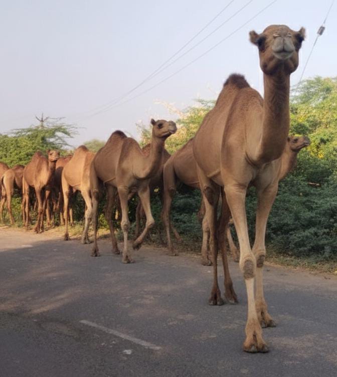 વડોદરા જિલ્લાના ડભોઈ પાસે આવેલી તરસાણા ચોકડી પર જોવા મળ્યો હતો. મોટી સંખ્યામાં ઊંટોના કાફલાને પસાર થતો જોઈ સ્થાનિક લોકોમાં ભારે આશ્ચર્ય અને કુતૂહલ સર્જાયું હતું. ધોરીમાર્ગ પર ઉભેલા લોકો આ દ્રશ્ય નિહાળવા માટે ટોળે વળ્યા હતા.ઘાસચારા અને પાણીની શોધમાં કચ્છી માલધારીઓનું સ્થળાંતર ​આ કાફલા અંગે વધુ વિગત મેળવવા માટે જ્યારે કાફલા સાથે ચાલી રહેલા માલધારી ભારાભાઈ મગુભાઈ રબારી (રહે. ગામ જાણવા, તાલુકો લખપત, જી. કચ્છ) સાથે વાત કરવામાં આવી, ત્યારે તેમણે આ લાંબી મુસાફરી પાછળનું કારણ જણાવ્યું હતું.