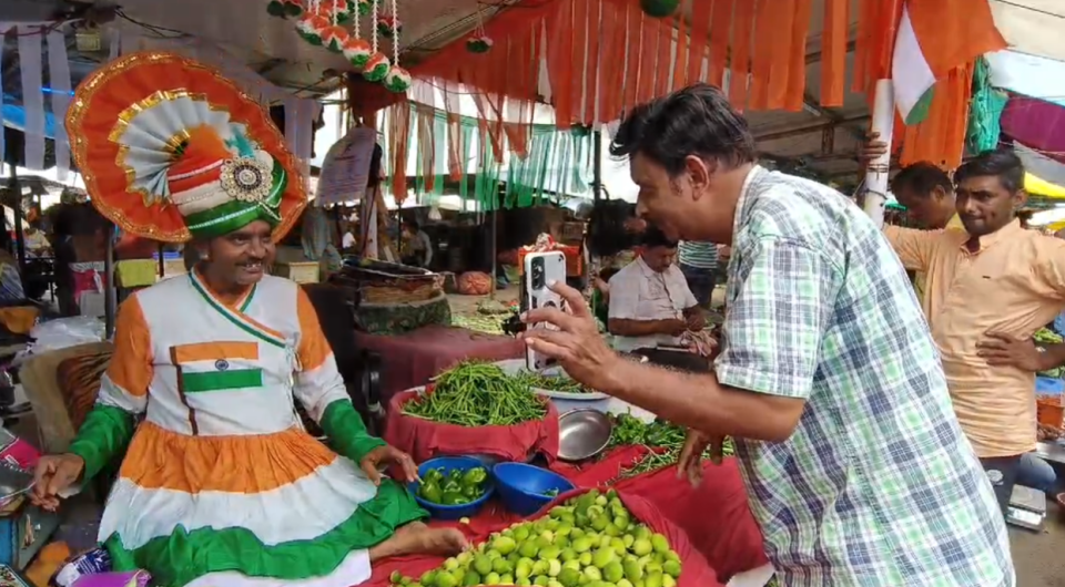 વડોદરા ખંડેરાવ માર્કેટ ખાતે કિરીટભાઈ પટેલ પોતાનું સ્વતંત્ર દિવસ ની ઉજવણી મોજ શોખથી કરી છે મોજ શોખ એટલે તિરંગા આભૂષણમાં પોતાને કંડારી શાકભાજી માર્કેટમાં બેઠા છે કિરીટભાઈ પટેલ છેલ્લા 40 વર્ષથી શાકભાજીનું વેપાર કરી રહ્યા છે દર વર્ષે તેમનું શોક છે કે કોઈ પણ તહેવાર હોય તેને મોજ શોખથી કરવો એવી જ રીતે 15 મી ઓગસ્ટ પગડી અને કેડિયું પહેરી તેમણે ઉજવણી કરી છે. શાકભાજીનો ભાવ તો ઉતાર ચડશે પણ કિરીટભાઈનું કહેવું છે કે મારી જોડે શોખ છે તે હું પૂરી કરતો આવું છું યુવાનોને દેશભક્તિ અને તેના વિશે હું મારી રીતે પહોંચાડતો રહું છું.