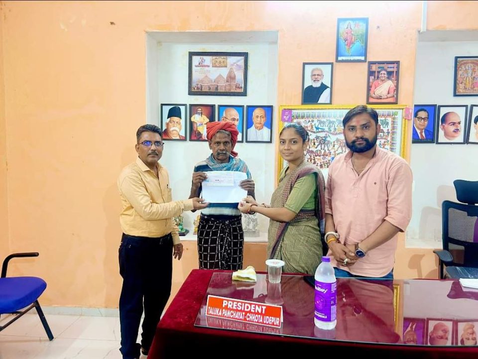 છોટાઉદેપુર તાલુકાના બોડગામના વતની રાઠવા દિતલિયાભાઈ નાયકાના બે બળદનું વીજળી પડવાથી મોત નિપજ્યું હતું. જેને લઇને આજે છોટાઉદેપુર તાલુકા પંચાયત વતી તાલુકા પંચાયત પ્રમુખ કલ્પનાબેન રાઠવાના હસ્તે સહાય રૂપે 64 હજારનો ચેક આપવામાં આવ્યો હતો. આ પ્રસંગે તાલુકા પંચાયત પ્રમુખ સાથે ઉપસ્થિત જિલ્લા ભાજપના યુવા નેતા સંગ્રામસિંહ રાઠવા અને તલાટી ઉપસ્થિત રહ્યા હતા.