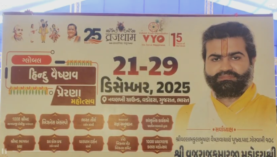 વડોદરા: વૈષ્ણવ આચાર્ય પૂજ્ય શ્રી વ્રજરાજ કુમાર મહોદય શ્રીની અધ્યક્ષતામાં વૈષ્ણવ સંપ્રદાયના 550 વર્ષના ઇતિહાસમાં પ્રથમ વખત સૌથી મોટો વૈશ્વિક મહોત્સવ વડોદરામાં યોજાવા જઈ રહ્યો છે. વૈષ્ણવાચાર્ય પૂજ્ય શ્રી વ્રજરાજ કુમારજી મહોદય દ્વારા સ્થાપિત વૈષ્ણવ સંપ્રદાયની વિશ્વસ્તરીય સંસ્થા VYO (વલ્લભ યુથ ઓર્ગેનાઇઝર), જે હાલમાં વિશ્વના 15 દેશોમાં સક્રિય રીતે કાર્યરત છે, તેની 15 વર્ષની ઉજવણી તથા પુષ્ટિમાર્ગ ગુજરાતના સૌથી મોટા આધ્યાત્મિક કેન્દ્ર ‘ધામ’ સંકુલના 25 વર્ષ પૂર્ણ થવાના ઉપલક્ષ્યે આ ભવ્ય આયોજન કરવામાં આવી રહ્યું છે.