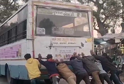 પેસેન્જર અને એસટીના સ્ટાફ મારી રહ્યા છે બસ ને ધક્કા