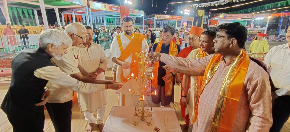 દર્ભાવતી-ડભોઇમાં ખેતીવાડી ઉત્પન્ન બજાર સમિતિ મેદાન ખાતે માં ગઢભવાની કલ્ચરલ ગ્રુપ દ્વારા આયોજિત નવરાત્રી મહોત્સવ ને વૈષ્ણવાચાર્ય પૂજપાદ ગોસ્વામી 108 શ્રી વ્રજરાજકુમારજી મહારાજશ્રી દ્વારા દીપ પ્રાગટ્ય કરી ખુલ્લો મુકાયો