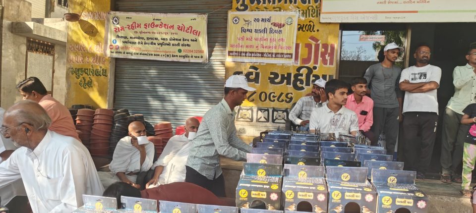 ચોટીલા પંથકમાં છેલ્લા 20 વર્ષથી એટલે કે બે દાયકાથી અનેકવિધ સેવાકીય પ્રવૃત્તિઓ કરતી સંસ્થા રામ રહીમ ફાઉન્ડેશન દ્વારા ચોટીલામાં દર વર્ષે 20 માર્ચના રોજ ચકલી દિવસની ઉજવણી નિમિત્તે વિનામૂલ્યે ચકલી ઘર અને પક્ષીને પાણી પીવાના કુંડાનું વિતરણ કરવામાં આવે છે જે નિમિત્તે ચામુંડા રોડ સ્થિત રામ રહીમ ફાઉન્ડેશન કાર્યાલય ખાતે સાંજે 04:00 વાગ્યે લીંબડી અજરામર સંપરદાયના પૂજ્ય શાસન પ્રભાવક આચાર્ય ડૉ.પ્રકાશ ચન્દ્ર સ્વામીજીની નીશ્રામાં શુભ હસ્તે અને દાતાઓની હાજરીમાં આ વિતરણ કરવામાં આવ્યું હતું. આજે 2000 ચકલી ઘર અને 2000 જેટલા પક્ષીને પાણી પીવાના કુંડાનું વિતરણ કરીને જીવ દયાની પ્રવૃત્તિ કરવામાં આવી હતી સંસ્થાએ ચોટીલા શહેર સહિત આજુબાજુની ગામની પ્રાથમિક શાળાઓ અને સીમાડાઓમાં અને ગામડાના વાડી વિસ્તારમાં ખેડૂતોને આ કુંડા નું વિતરણ કરવામાં આવ્યું જેના કારણે આ ઉનાળાની ગરમીમાં ભર બપોરે પક્ષીને પીવાનું પાણી મળી રહે અને આપણું પારિવારિક પક્ષી આપણી વચ્ચેથી લુપ્ત થતી ચકલીને માળો મળે એ હેતુથી ચકલીના માળાનું વિતરણ કરવામાં આવ્યું જેથી આપણી વચ્ચે ચકલી હમેશા રમતી રહે. રામ રહીમ ફાઉન્ડેશન-ચોટીલા અને સોની જશવંતલાલ ઝીણાભાઈ જ્વેલર્સ શોરૂમ તરફથી આ ચકલીના માળા અને પક્ષીને પાણી પીવાના કુંડાનું વિતરણ કરવામાં આવ્યું હતું આ તકે અરિહંત ઇન્ડસ્ટ્રીઝ વાળા મનસુખલાલ શાહ અને સોની જશવંતલાલ ઝીણાભાઈ શોરૂમ વાળા જશુભાઈ સોની અને લાલાભાઇ સોની ખાસ ઉપસ્થિત રહીને આ સેવાનો લાભ લીધો હતો. આ કાર્યને સફળ બનાવવા માટે રામ રહીમ ફાઉન્ડેશન ચોટીલાના પ્રમુખ મોહસીનખાન પઠાણ, ઉપપ્રમુખ મેહુલભાઈ ખંધાર,જ્યોતિબેન સીતાપરા, પાયલબેન મોરી,ગોપાલભાઈ જાદવ, મોઈન ખાન પઠાણ, સહિત ધવલભાઇ કોરડીયા અને બળદેવભાઈ કોરડીયા જેવા પક્ષિપ્રેમીઓએ આ કાર્યક્રમને સફળ બનાવવા જહેમત ઉઠાવી હતી..