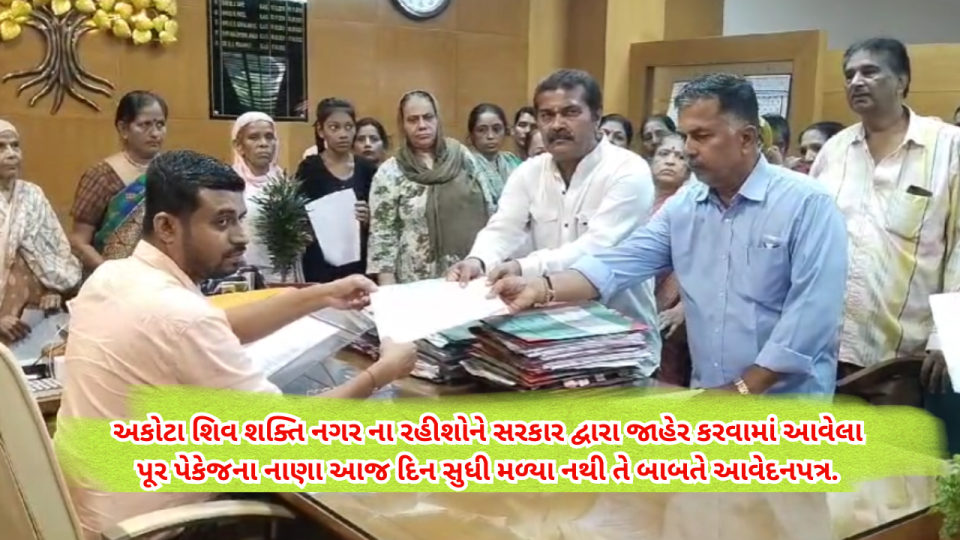 લગભગ દોઢ મહિના પહેલા ભારે વરસાદના કારણે સમગ્ર વડોદરાને ભયંકર પુરનો સામનો કરવો પડ્યો હતો અને અકોટા પોલીસ લાઈવ ની સામે આવેલી શિવ શક્તિ નગરમાં પણ ત્રણ દિવસ સુધી લોકોના ઘરોમાં આશરે પાંચ પાંચ ફૂટ પાણી ભરાઈ ગયું હતું જેના કારણે લોકોના ધરવખરીનો સામાન, ફર્નિચર, ઇલેક્ટ્રોનિક સામાન, વાહનો વગેરે બધું જ પાણીમાં ડૂબી ગયા હતા અને લોકોને ભારે નુકસાની નો સામનો કરવો પડ્યો હતો. આ ત્રણ દિવસમાં તંત્ર અને ચૂંટાયેલી પાખી તરફથી કોઇપણ પ્રકારની રહત આપવામાં આવી ન હતી અને પ્રજાને શું તકલીફ થઈ રહી છે તે પણ જોવામાં આવ્યુ ન હતું અને તેના કારણે સમગ્ર વડોદરા ના પૂરગસ્ત વિસ્તારમાં તંત્ર અને ચૂંટાયેલી પાખો ઉપર ભારે રોષ હતો જેના કારણે ગુજરાત સરકાર દ્વારા તમામ પૂરગ્રસ્ત વિસ્તારના લોકોને રાહત પેકેજ જાહેર કરવામાં આવ્યું હતું. શિવ શક્તિનગરમાં આશરે એક મહિના પહેલા સરકારી અધિકારીઓ દ્વારા રાહત ફોર્મ ભરવામાં આવ્યા હતા અને સર્વે પણ કરવામાં આવ્યું હતું. આજે એ વાતને આખરે એક મહિના ઉપરનો સમય વીતી ગયો છે. સોસાયટીમાં માત્ર 10% લોકોને પુર રાહત ના પૈસા મળ્યા છે બાકીના 90% ના લોકોને પુર રાહતના પૈસા આજ દિન સુધી મળ્યા નથી. આ બાબતે મામલતદાર કચેરીએ વારંવાર અલગ અલગ માધ્યમથી પૂછવામાં આવે આવ્યું હતું પણ કોઈ તટસ્થ જવાબ મળ્યો ન હતો જેના કારણે આજે સમગ્ર સોસાયટીના લોકો એકત્રિત થઈને કલેકટર કચેરી ખાતે આવેદનપત્ર આપવામાં આવ્યું હતું, સાથે કલેકટર શ્રી સમગ્ર મામલાની તપાસ કરે અને તાત્કાલિક યોરણે પુર રાહત ની રકમ બાકી રહેલા સદસ્યના ખાતામાં થાય તેવી માંગ કરી હતી,