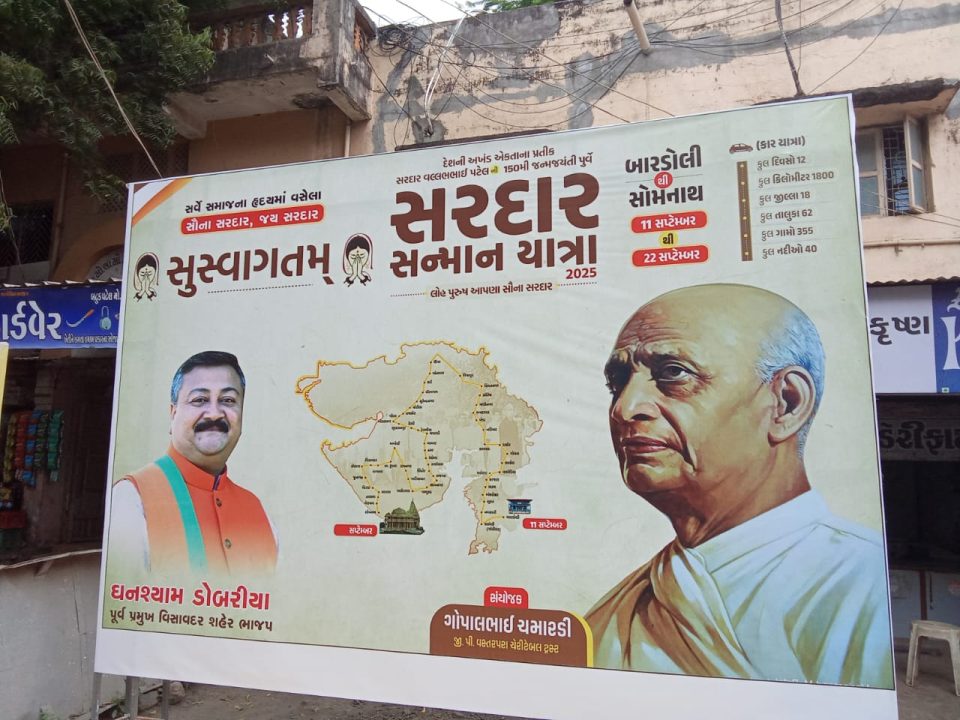 વિસાવદર ખાતે સરદાર સન્માન યાત્રાનું થયું ભવ્ય સ્વાગત આજે વિસાવદર ખાતે બપોરના ત્રણ વાગ્યે બારડોલી થી સોમનાથ સરદાર પટેલ સન્માન યાત્રા વિસાવદર ખાતે આવી પહોંચી હતી . જેમનું સ્વાગત કરવા માટે વિસાવદરના સર્વ સમાજના આગેવાનો અગ્રણીઓ રાજકીય નેતાઓ ધાર્મિક વડાઓ ભાઈઓ બહેનો ઉત્સાહભેર હાજર રહ્યા સાથે પૂર્વ ધારાસભ્ય હર્ષદભાઈ રીબડ્યા પણ જોડાયા હતા.હતા વિસાવદરના સરદાર પટેલ ચોક ખાતે આવેલ સરદાર વલ્લભભાઈ પટેલના પ્રતિમાને ફુલહાર કરી વિસાવદરના સમગ્ર સમાજના આગેવાનો વચ્ચે યાત્રાને સન્માન સાથે સોમનાથ તરફ વળાવવામાં આવી હતી . લોકોમાં ભારે ઉત્સાહ જોવા મળ્યો હતો . આવી રીતે વિશાદ તાલીકાની શાળાના બાળકો પણ રેલી સાથે સન્માન યાત્રામાં જોડાયા હતા . રિપોર્ટર શ્યામ ચાવડા વિસાવદર