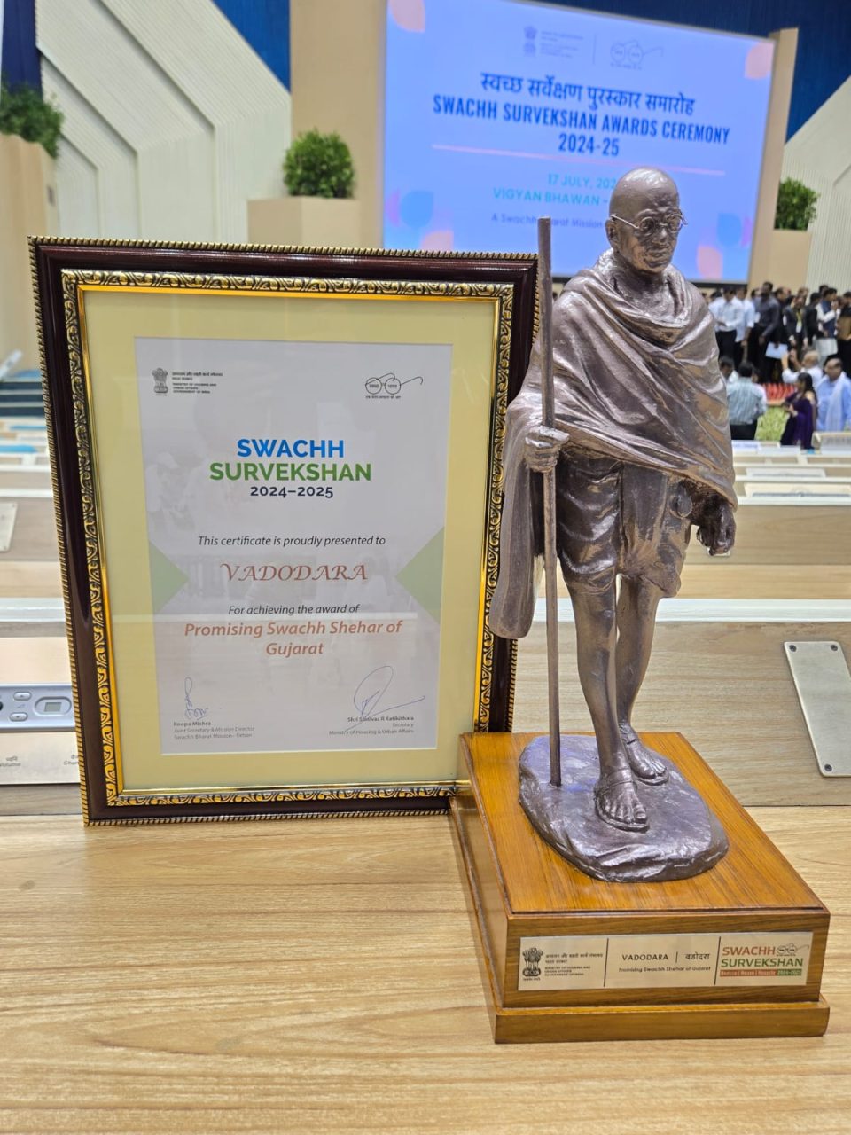 સ્વચ્છતા સર્વેક્ષણ અને સ્વચ્છ ભારત મિશન અંતર્ગત આજે 9મી આવૃત્તિ અંતર્ગત અલગ અલગ 45થી વધુ શહેરો એ ભાગ લીધો હતો આજે વડોદરાને પ્રોમિસિંગ ક્લીન સીટીનો એવોર્ડ પણ મળ્યો
