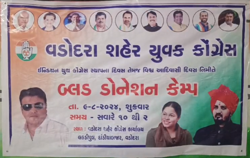 ઇન્ડિયન યુથ કોંગ્રેસ સ્થાપના દિવસ તેમજ વિશ્વ આદિવાસી દિવસ છે જે નિમિત્તે આજે વડોદરા યુથ કોંગ્રેસ દ્વારા દાંડિયા બજાર ખાતે આવેલ કોંગ્રેસ કાર્યાલય ખાતે યુથ કોંગ્રેસ દ્વારા બ્લડ ડોનેશન કેમ્પનું આયોજન રાખવામાં આવ્યો હતો કેમ્પમાં મોટી સંખ્યામાં યુથ કોંગ્રેસના કાર્યકરો તથા સભ્યો મોટી સંખ્યામાં બ્લડ ડોનેટ કહ્યું હતું આગલા ડોનેશન કેમ્પ નો મુખ્ય ઉદ્દેશ વડોદરા જિલ્લામાં જે લોકોને બ્લડને લઈને સમસ્યા જેને લઈને યુથ કોંગ્રેસ દ્વારા બ્લડ પૂરું પાડવામાં આવે તે માટે આજે યુથ કોંગ્રેસ દ્વારા બ્લડ કેમ્પનું આયોજન રાખવામાં આવ્યું હતું આ બ્લડ કેમ્પમાં મુખ્ય ઉપસ્થિત નેશનલ પ્રવક્તા આશિષભાઈ કોટડીયા તથા મહામંત્રી જીગરભાઈ વગેરે ઉપસ્થિત રહ્યા હતા અને બ્લડ ડોનેટ કરવામાં આવ્યું હતું